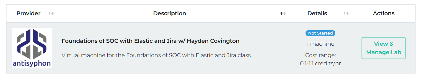 The page will then refresh and you should see the listing for the workshop, something like: SOC Detection Engineering w/ Hayden Covington. Click on “View & Manage Lab” to access the VM.