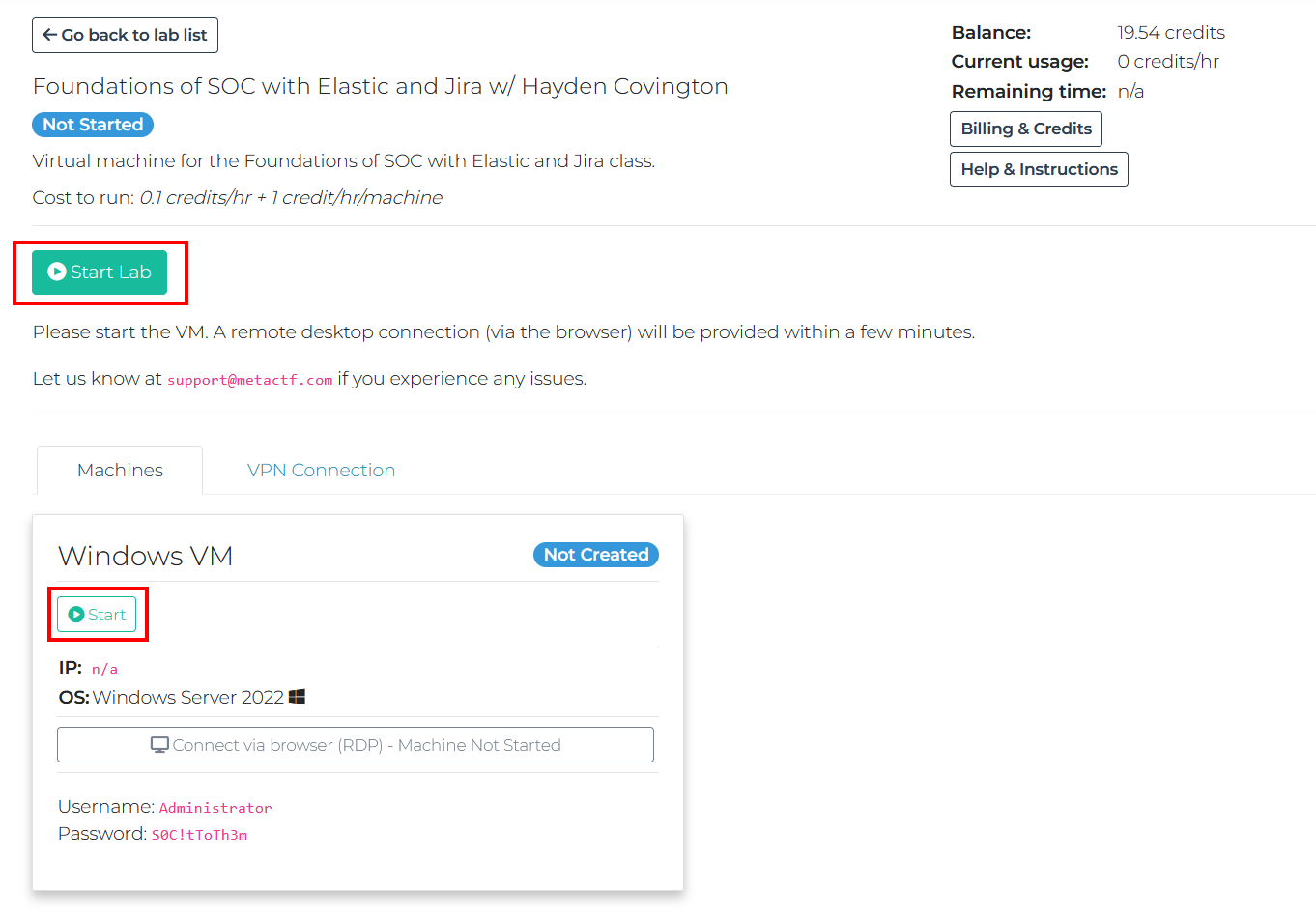 - In between days or labs, you can Stop your VM if you want to conserve credits (stopped VM's still consume a small amount of credits). Please note that you should not destroy the VM during the class as it needs to continue sending logs to Elastic until after the class at least.