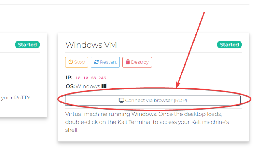 After a few minutes the machine will start. You can connect via your browser* by clicking “Connect via browser (RDP)”.