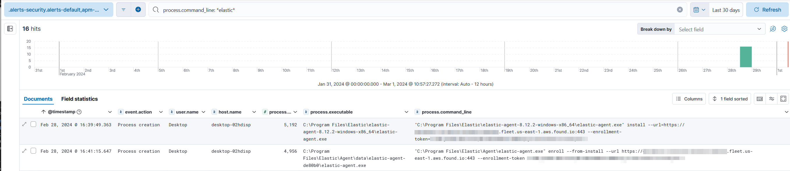 process.command_line: *elastic*we almost immediately can see the command are looking for, both for installation and enrollment. We can tell by the process command line flags of install and enroll.Maybe if we wanted we could have also filtered the command_line also by “enrollment” or some other key word we’re looking for, for other ideas.