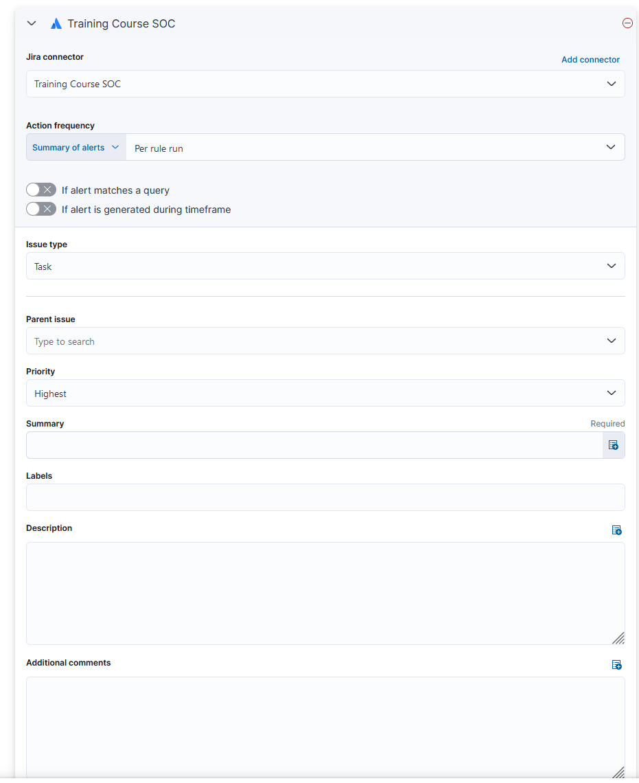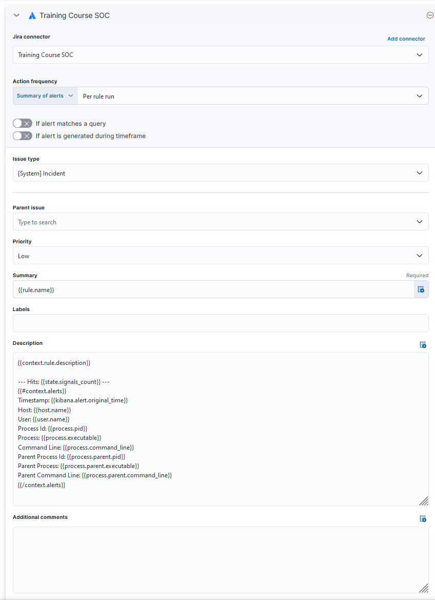 - You can set this up how you like, but how I set mine up can be seen below with examples on how to include the alert values from Elastic. At a minimum make sure you set the Issue type as “[System] Incident” or you won’t trigger the SOC workflow in your Jira.
