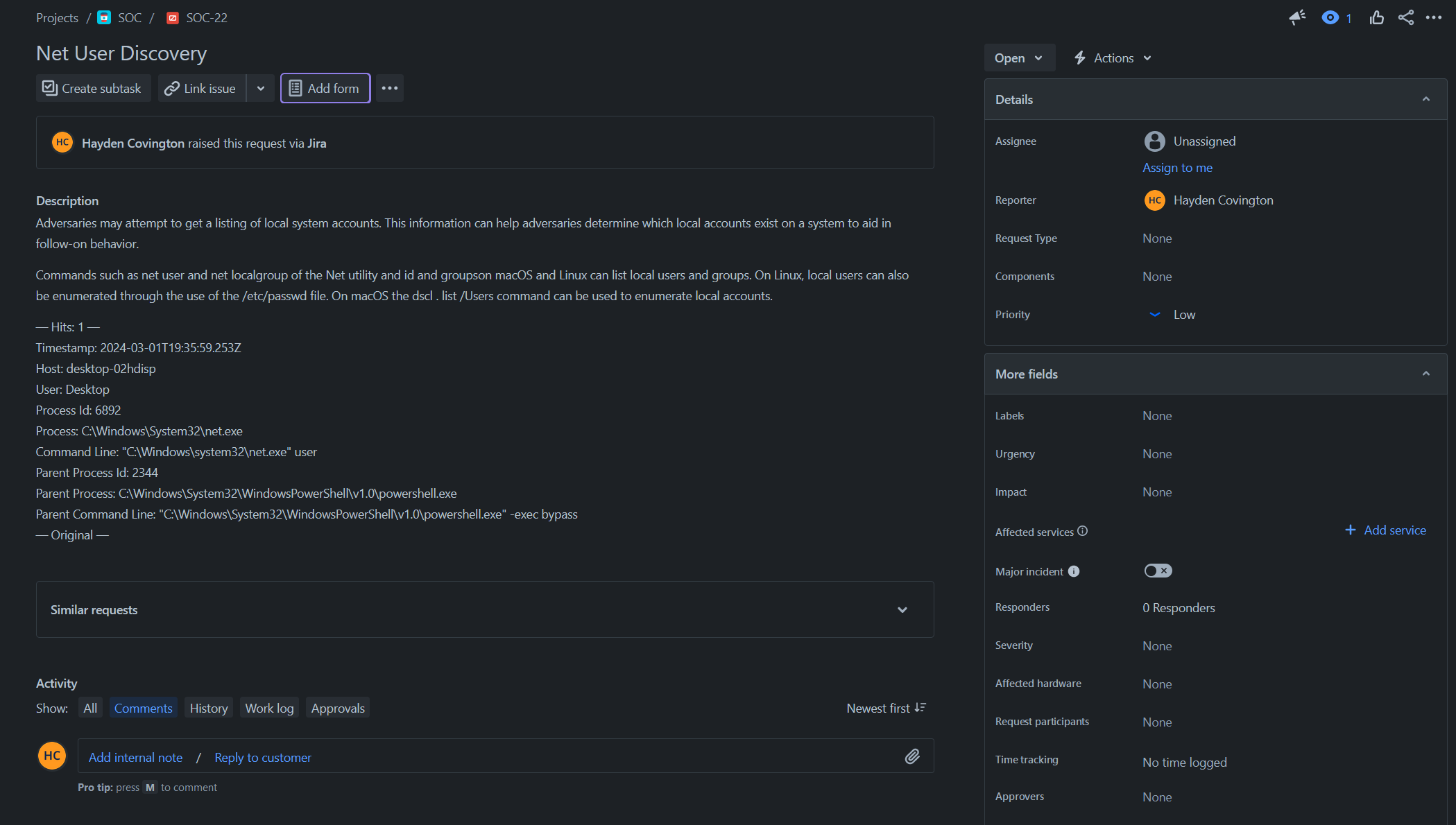 - Create a detection for someone querying the local users on a host using net user (T1087.001: Account Discover: Local Account)