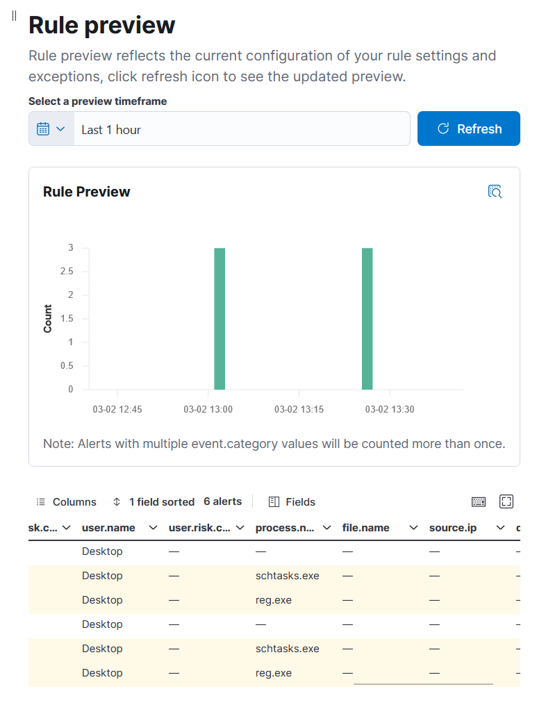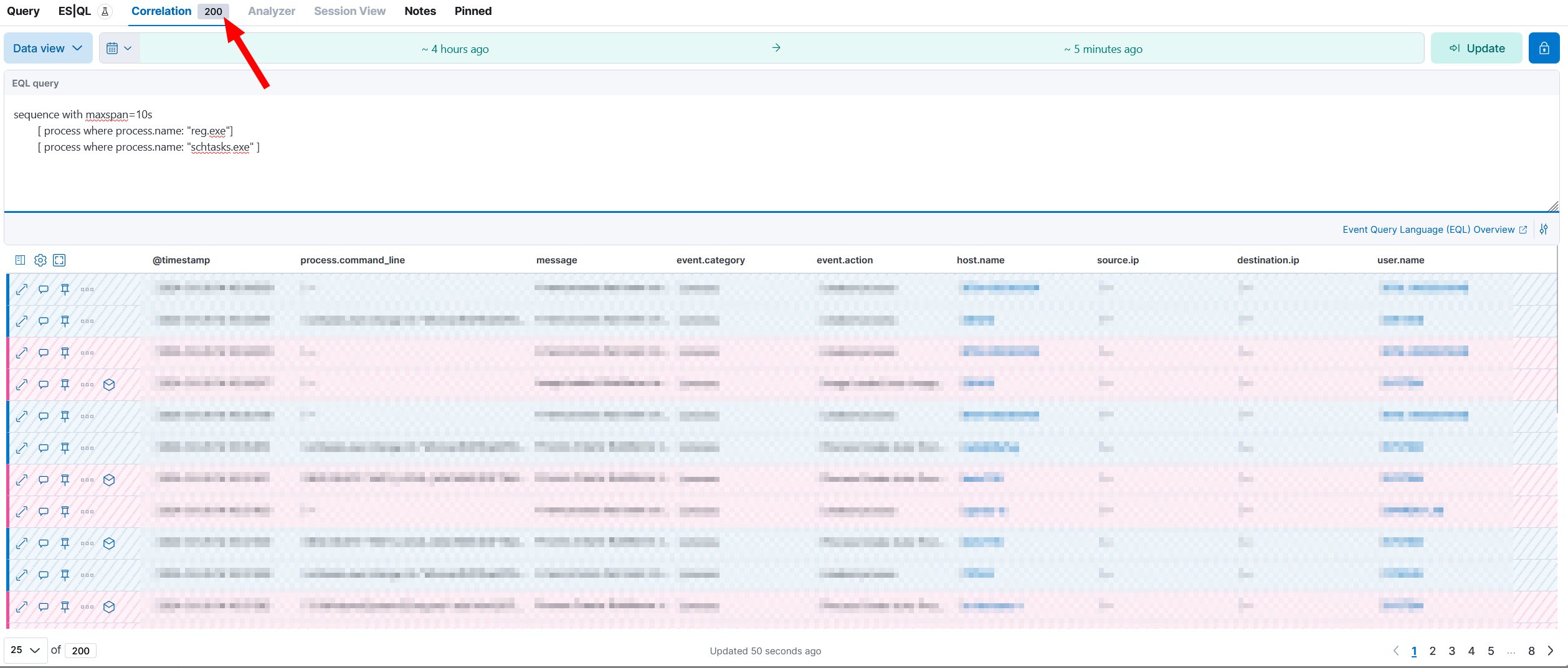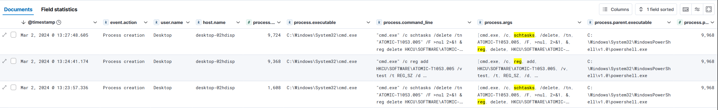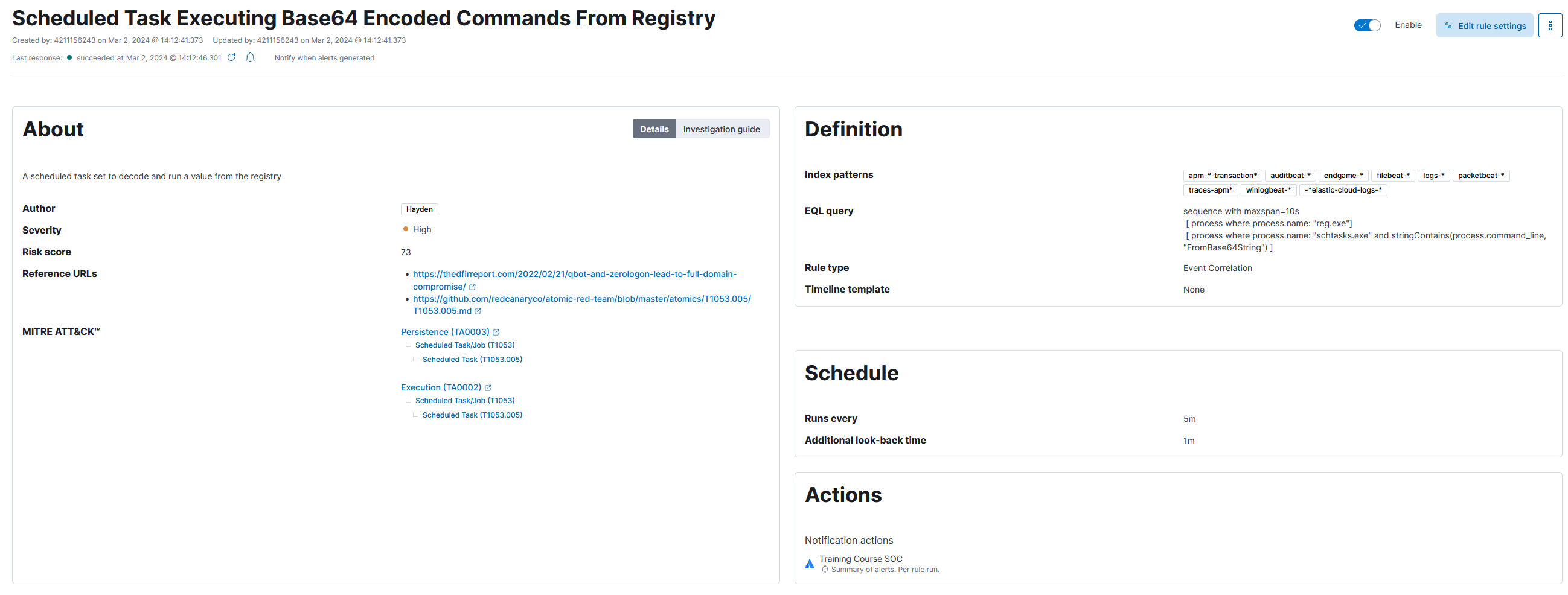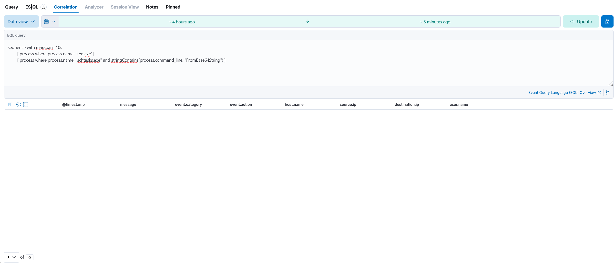 sequence with maxspan=10s [ process where process.name: "reg.exe"] [ process where process.name: "schtasks.exe" and stringContains(process.command_line, "FromBase64String") ]You’ll see I stuck with the base query, but I added an additional restriction to the scheduled task portion requiring that the command being run decodes a Base64 value, which I would consider to be abnormal.