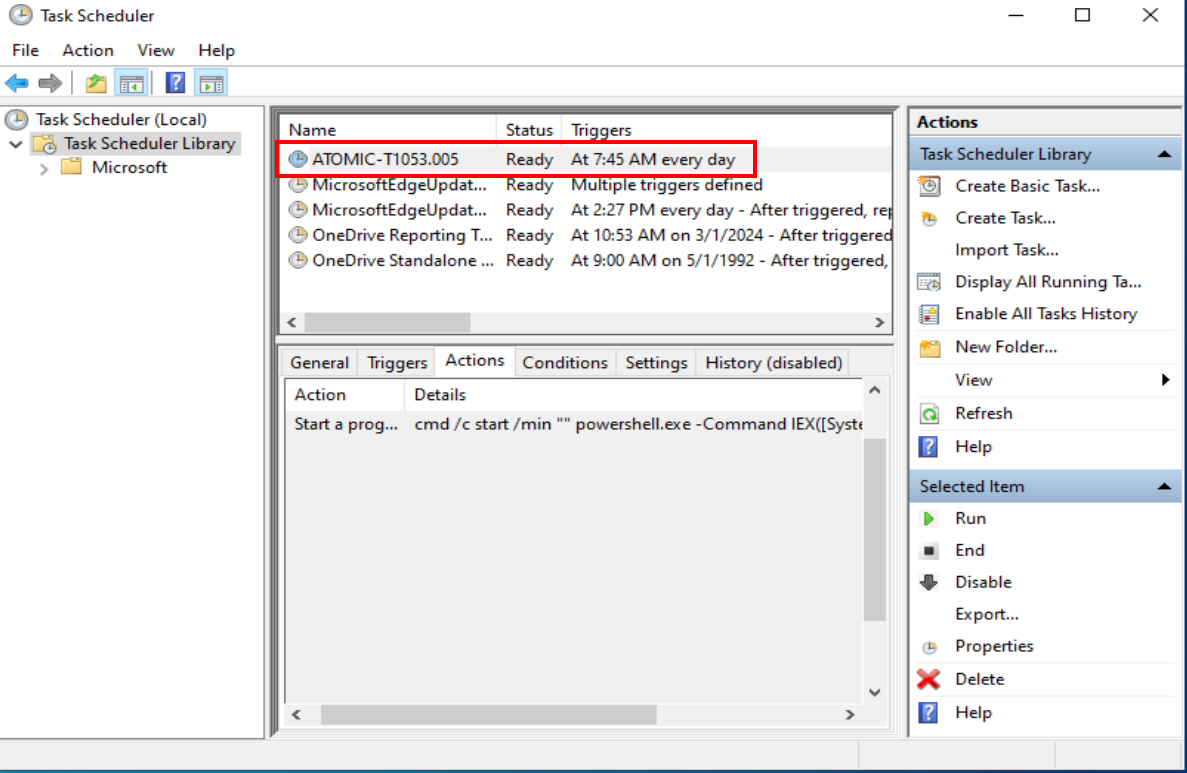 Scheduled task named “ATOMIC-T1053.005” which triggers every day, running a PowerShell command.