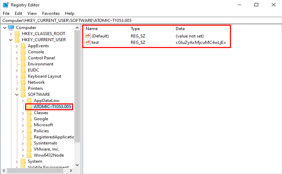 A registry value of “test” has been created under the key “ATOMIC-T1053.005”. The data of test is in Base64.