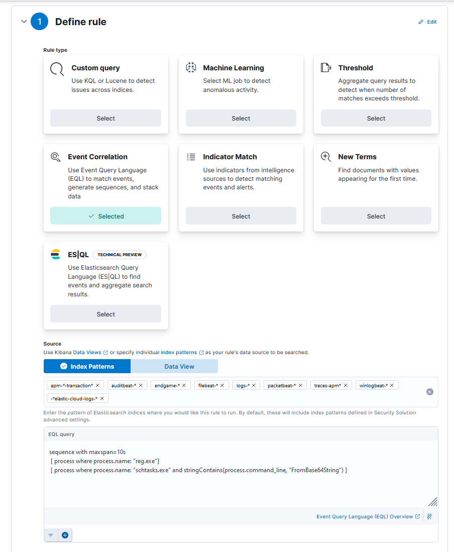 Security > Rules > Detection rules (SIEM)and create a new rule. - This rule should be of the type “Event Correlation (EQL)” and you can leave the index patterns as is again.