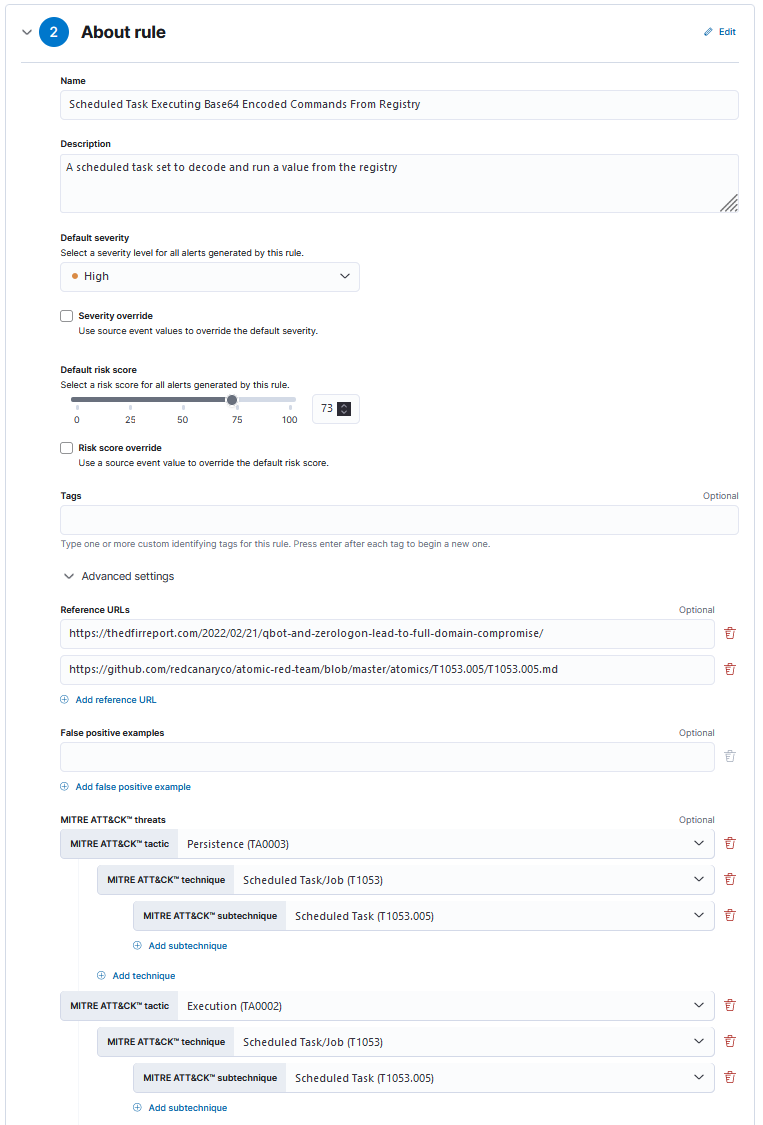 - Under the advanced section, make sure to include any reference URLS and the MITRE tactics in question (T1053.005). I specifically included both Persistence and Execution since that made sense to me.