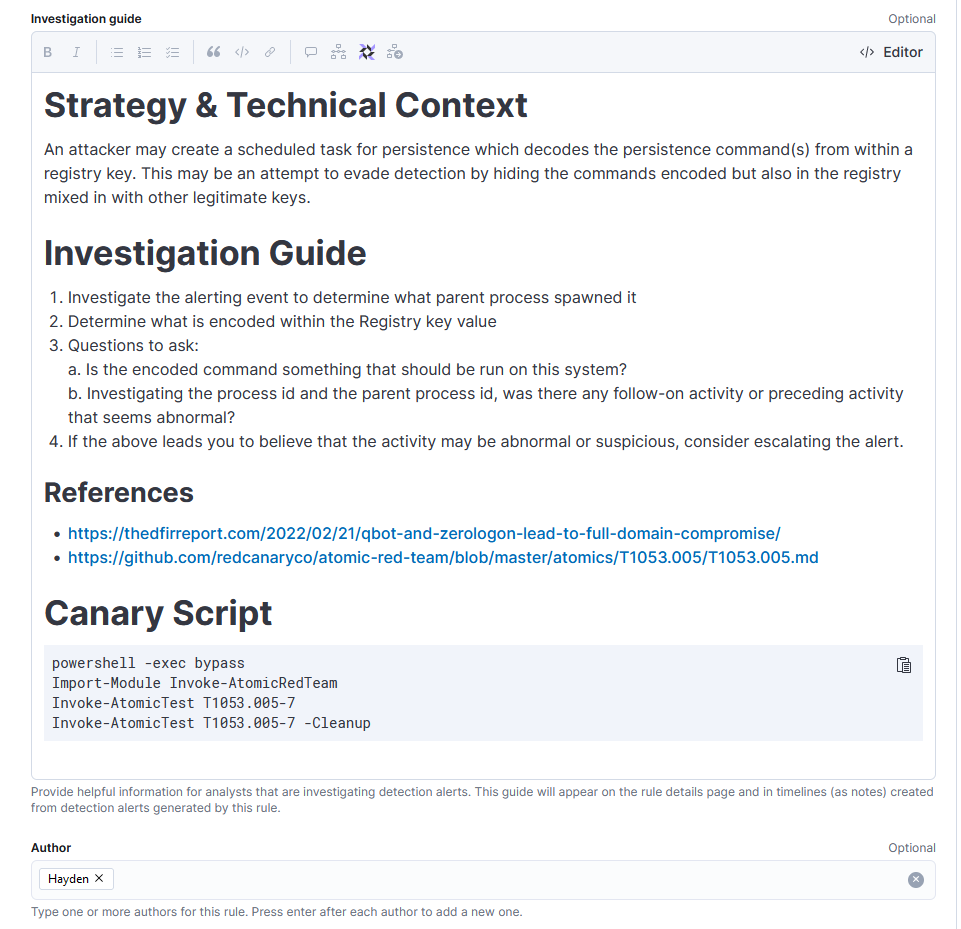 - For Investigation guide I copied the sort of template we came up with for the Net User Discovery detection and just replaced portions of it. I also included the Atomic commands needed to trigger this alert in the case of a test. If this alert didn’t have an atomic, I could just include the commands themselves.