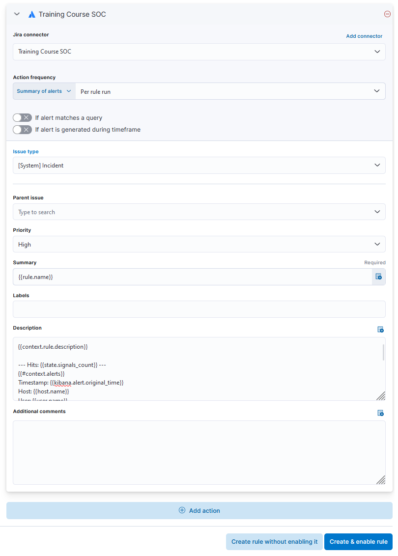 Under Rule actions, we again need to add that Jira connector. Here is where we’re going to make use of the connector values we wrote up for Net User. Just use the same ones since they’re dynamic values.