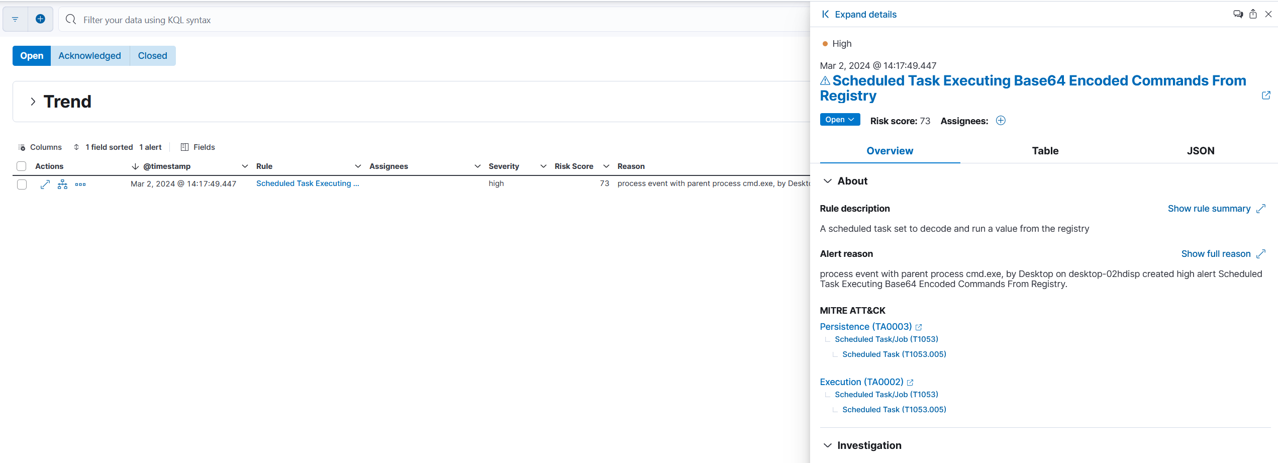 Head over to Elastic and I now challenge you to find the activity that just occurred. Not just one of the commands; write a KQL query that catches both events, the scheduled task creation and the registry key creation.