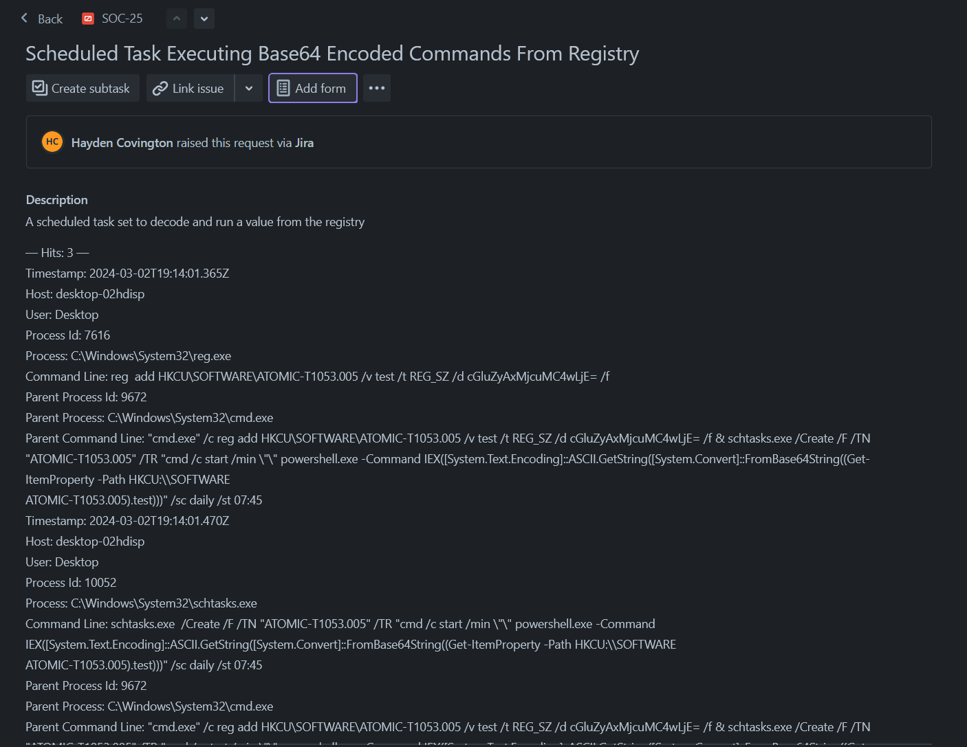 - It’s possible that the attacker may create the task and the registry key with two different commands, at which point the command arguments would not contain both of the arguments we are looking for.
