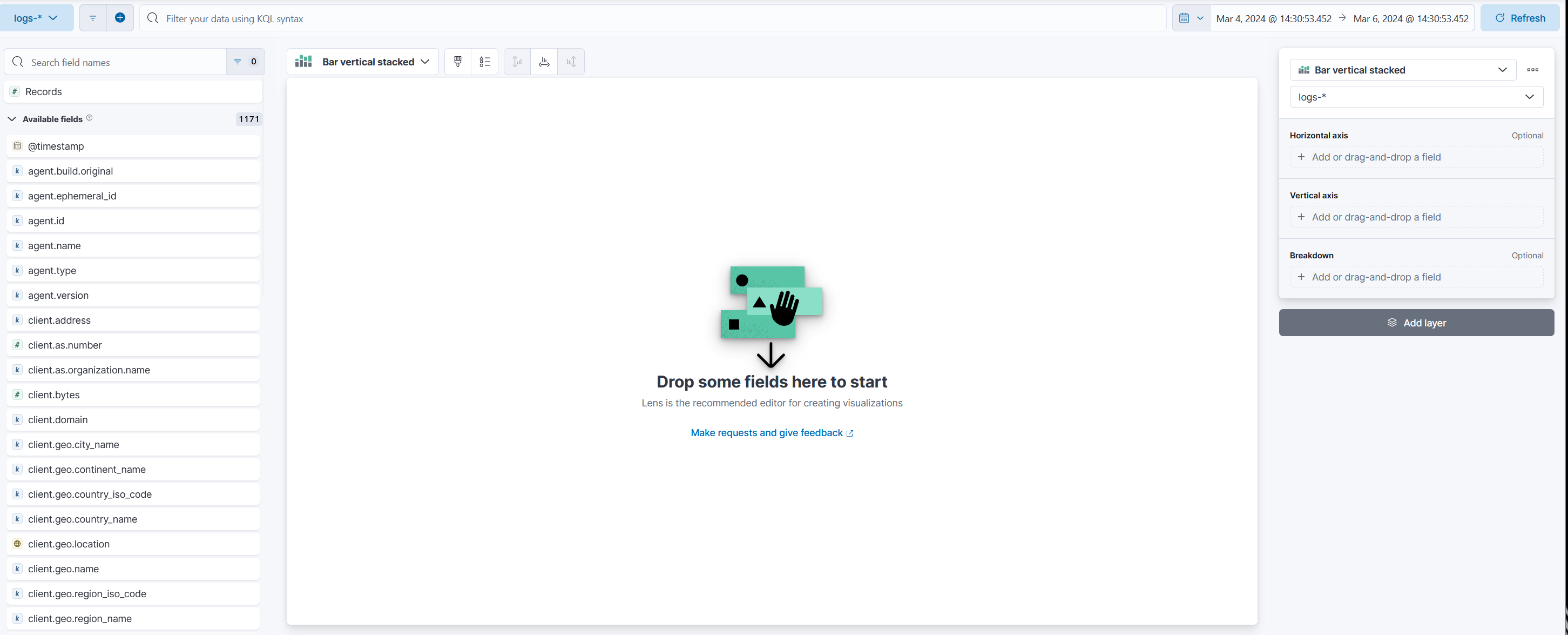 You can add fields to this visualization by dragging from the left hand side, or by adding them on the right. For now lets add them from the left. Find the