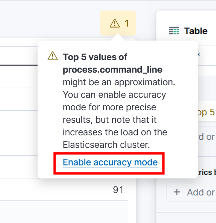 If you see an exclamation in the top right, it’s telling you about “Accuracy mode”. Some visualizations have to toggle this option on to ensure that all data is accurately selected for the visualization. This adds more load to the cluster, but is necessary in some situations. In our case, let’s turn that on.