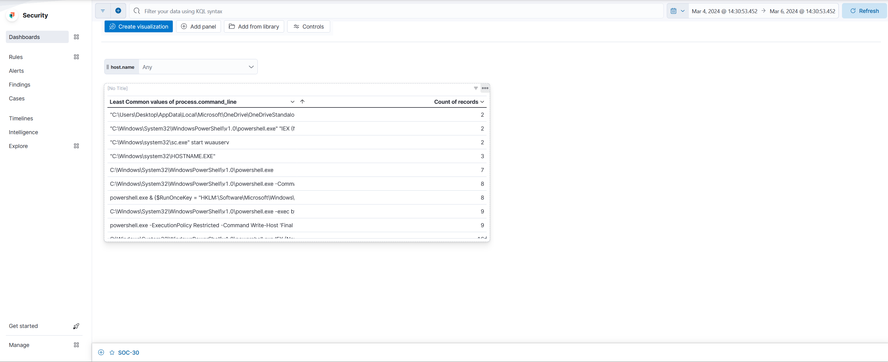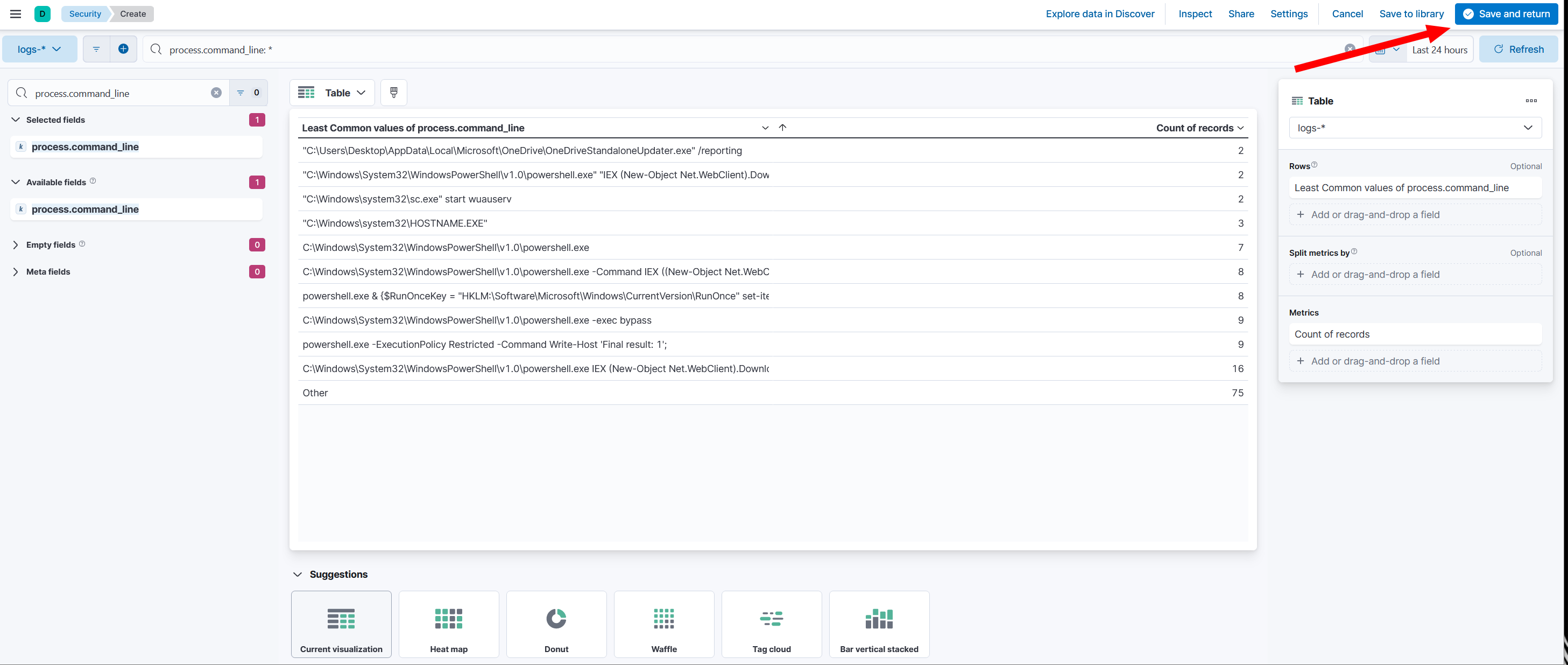 Now let’s make a panel for process command line executions; specifically, the least common command line executions. Click “Create visualization” or